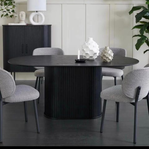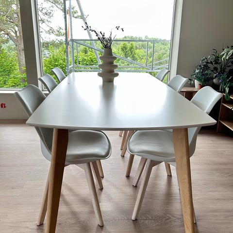 Selger dette spisebordet da vi ønsker noe større. Bordet ble kjøpt i mai 2025 og er som nytt, med unntak av en liten «skrape» nederst på foten (se bilde 11). Vurderer å selge noen av spisestolene til 700.- per stk.