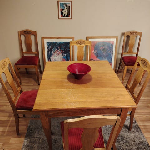 Ekte eikebord med 4 stoler i eik. Lengde 124 cm, med 3 klaffer totalt 220 cm lang. Bredde 89 cm. 74 cm høyt.