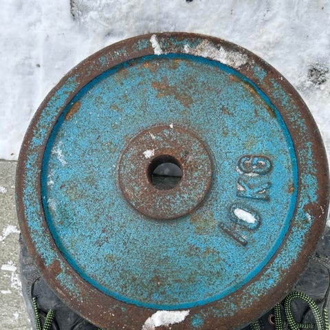 Vektplater i forskjellige størrelser: 2,5 kg, 5 kg og 10 kg. Platene har håndtak for enklere håndtering og er fargede i gul, grønn og oransje for enkel identifisering.