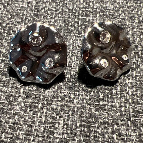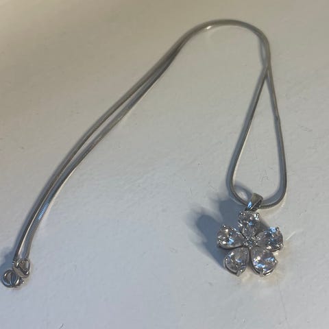 Dette sølvsmykket likner et Swarovski-anheng/smykke med kjede, som har sju ovale ringer med krystaller på den ene siden og blanke på den andre.