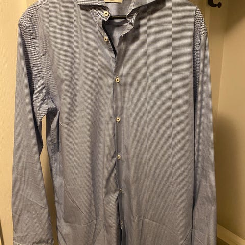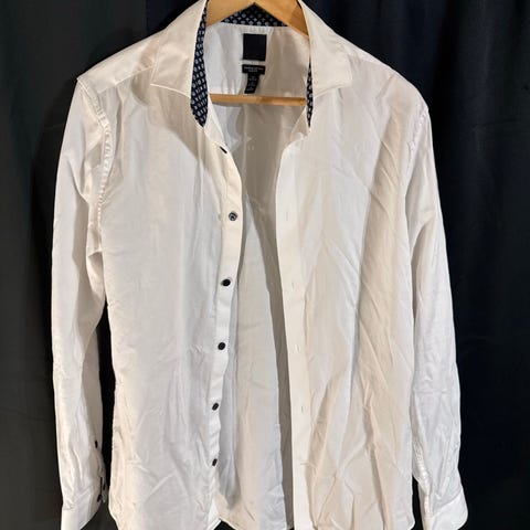 H&M 1576 skjorte i beige farge, laget av polyester. Passer for menn i størrelse S. Skjorten har kort erme og en strukturert overflate.Stor i størrelsen, nærme M
