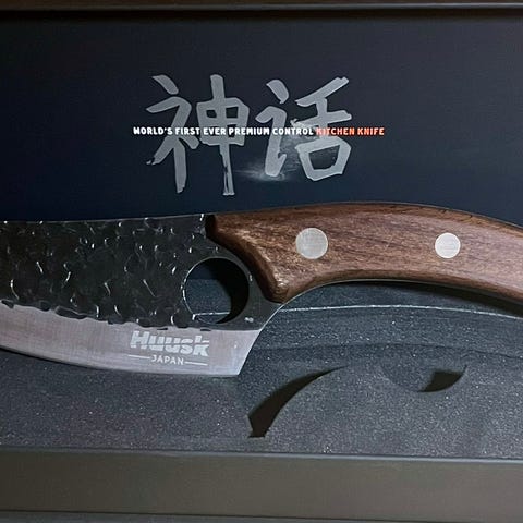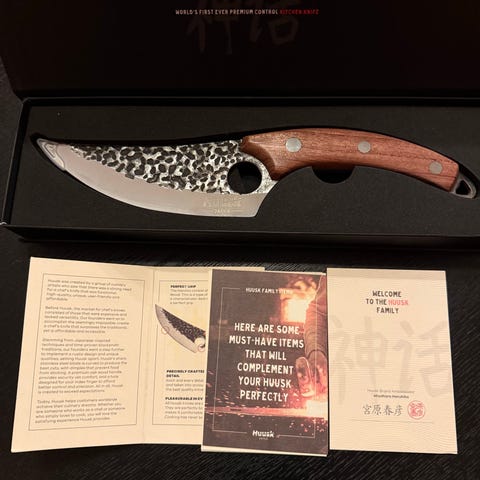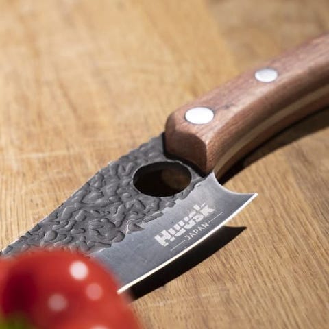 Huusk Japan kjøkkenkniv med treskaft. Kniven har et smidd blad med en hamret overflate og et ergonomisk håndtak i tre. Designet for presisjonskutting i kjøkkenet.