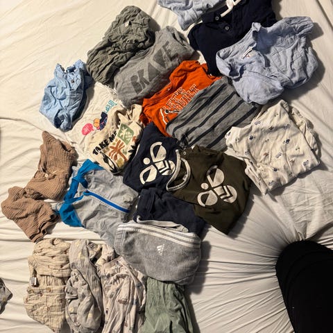 5 bukser, 4 shorts, 5 t-shorte, 2 gensere, 6 skjorter. Noe er lite brukt, noe mer brukt men mye bruk igj
