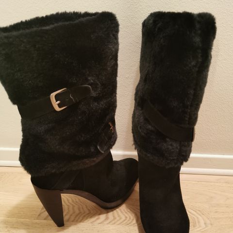 Høyhælte støvletter i ekte svart skinn. Brukt en gang