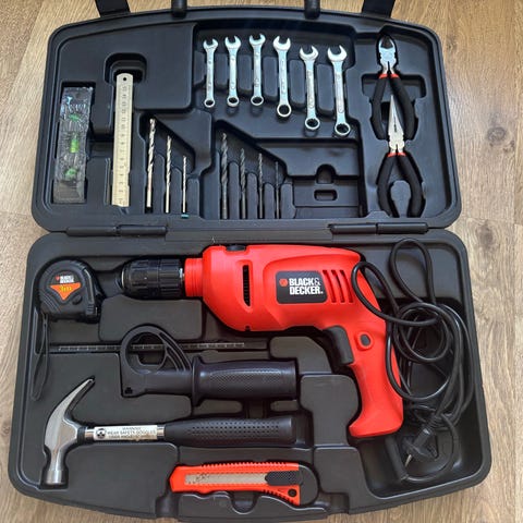 Black & Decker EGBL14K boremaskin med 14,4 V lithium-ion batteri. Leveres med batterilader og oppbevaringskoffert. Farge: rød og svart.