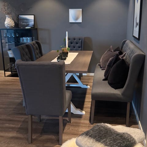 Sittegruppe brukt på kjøkken. Veldig gode å sitte i. Solid konstruksjon. Stoler og sofa er trekt i Melton ull. Kan leveres i Bergensområdet mot kjøregodtgjørelse.