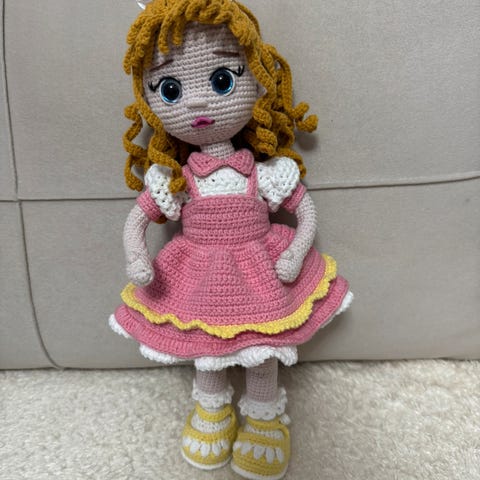Håndlaget strikket teddy laget av strikket materiale. Bamsen har en gråbrun farge og er designet for barn som leketøy.