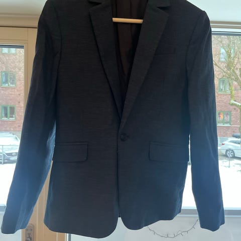 H&M blågrå dressjakke for gutt i størrelse 152. Jakken har to knapper foran og knappedetaljer på ermene. Den er foret på innsiden og har en klassisk dressjakkeutforming.