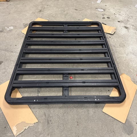Takstativ i svart farge laget av metall. Passer for montering på takbiler for å bære ekstra last som takbokser eller annet utstyr. Rammen har flere tverrstenger for stabilitet og festeanordninger for sikker montering.
