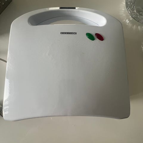Disney Mikke Mus Toast- og vaffeljern (2 i1) med rød og sølv farge. Egnet for å lage toast og vafler med Mikke Mus-design.