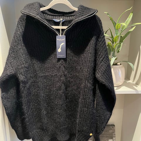 Nystrikket genser i ganngarnet merino tweed 65%merino,15% alpaca,15%acryl,5% polyester i i str M med overvidde på 106 cm.Genseren er god myk å varm.Genseren er ikke woolland men måtte velge noe for å komme videre