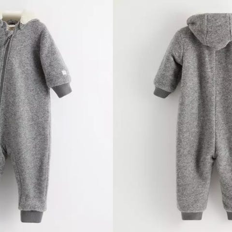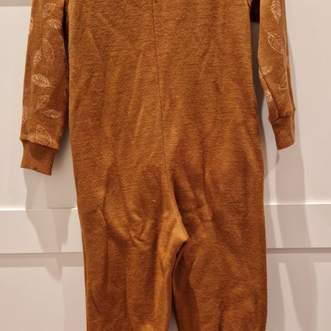 Det er glidelås, og strikk i begge sider, og ved håndledd og anklene. 4 søte broderte dyr til pynt.