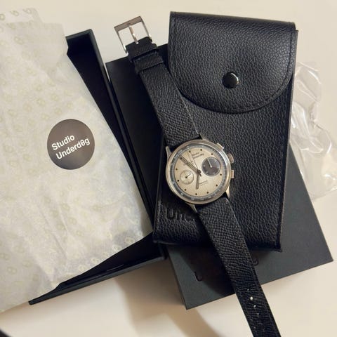 **OW CHRONOGRAPH** leveres også med en vintage-inspirert racingrem i naturlig, aldret skinn og lin, håndlaget av et av Italias fremste garverier. Den eksklusive remmen er avsluttet med en børstet tornspenne i rustfritt stål, signert «OWZ 1956».