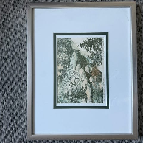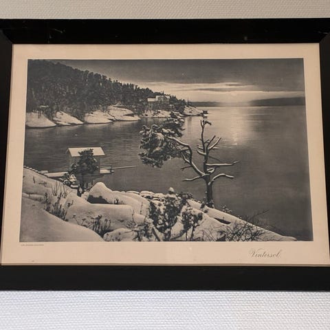 Bildet er profesjonelt innrammet i enkel gullramme og fremstår som dekorativt og lettplassert.