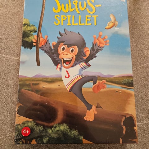Julius brettspill utgitt Damm. Uåpnet i plast. Originalt spill fra 80-tallet fra Dyreparken i Kristiansand og sjimpansen Julius. Samleobjekt.