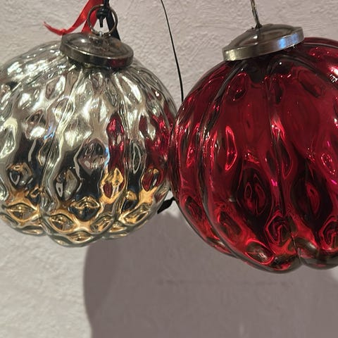 8 stk julekuler i glass. 4 stk grønne og 4 stk sort med gull/sølv detaljer/glitter. 2 stk av hver. Dråpeformede fra Bohus, de runde fra Europris. Selges helst samlet.