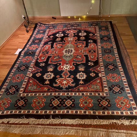 Grunnet overgang fra stort hus på Nordstrand til enklere hus i Vestby selges det fine teppet vi fikk i bryllupsgave. Teppet er nydelig men passer ikke inn i stilen i dette huset.