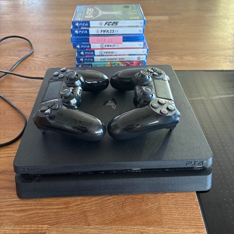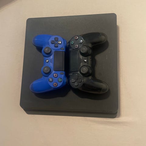 PlayStation 4 Slim 500GB spillkonsoll med tilhørende kontroller. Selges fordi den ikke blir brukt.