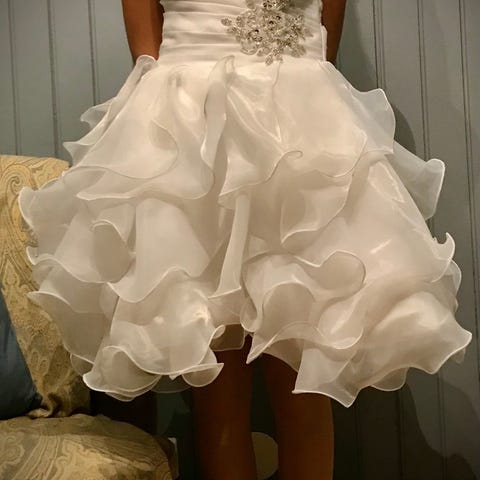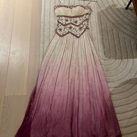 Kjole til spesiell anledning i størrelse S, farge rosa/korall med snøring i ryggen. Kjolen har dekorative detaljer med steiner på overdelen og en voluminøs, lagdelt skjørtedel.
