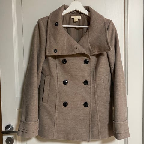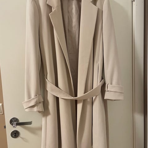H&M kåpe i beige farge, størrelse 48 for kvinner. Laget av polyester materiale. Kåpen har knapper i front og lommer på sidene. Selges for 300kr.