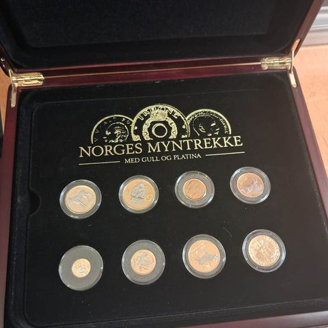 Syv mynter fra kong Olav Vs myntrekke, belagt med 24 karat rent gull og påført fargemotiv. Utgitt av Samlerhuset.