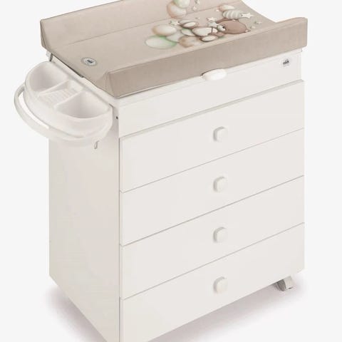 Cam Asia stellebord med integrert badekar og oppbevaringsskuffer i hvit farge. Stellebordet har polstret stellematte med barnevennlig motiv. Produktet er laget for enkel stell og bading av barn, med praktiske oppbevaringsmuligheter.