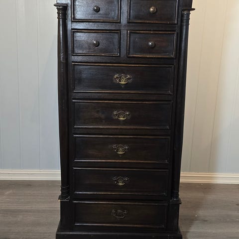 Normal bruksslitasje og patina som gir karakter, inkludert nummerering på baksiden av skuffene. Det er også en mindre skade nederst på høyre side (vist på bilde), lite synlig i helheten.