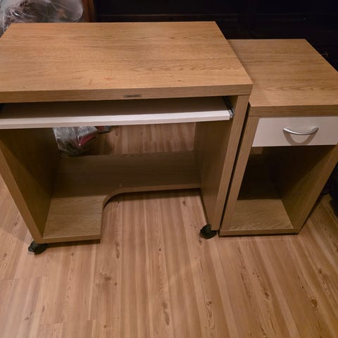 Selger 1 stk skrivepult med 3 tilsvarende bokskap/ klesskap i lys‘ finer. Ble kjøpt på Skeidar. Veldig lite brukt. Fremstår som nesten ny. Skrivepult har en liten hakk helt bakerst på skriveplaten. 1 skap med 2 dører og 2 skuffer. De andre 2 skap med 2 dører. God plass til oppbevaring av bøker og permer. Veldig tunge og solide møbler. Pulten 500 kr., 3 skap, hver 500 kr, selges helst samlet