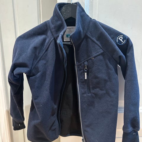 Jakke i fleece fra Polarn O. Pyret. Den er ensfarget, mørkeblå. Str 122/128.