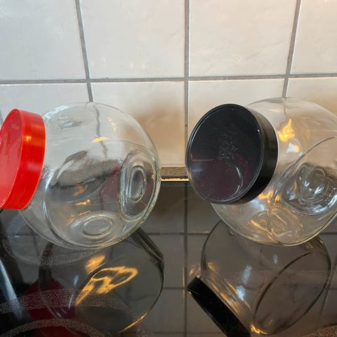 Høyde 17 cm, diameter i bunnen ca 8 cm. Pris pr stk. Skrift på glasset : L`IDEALE BREVETTE S. GI. D. Gi. Fransk. Landhandel.
