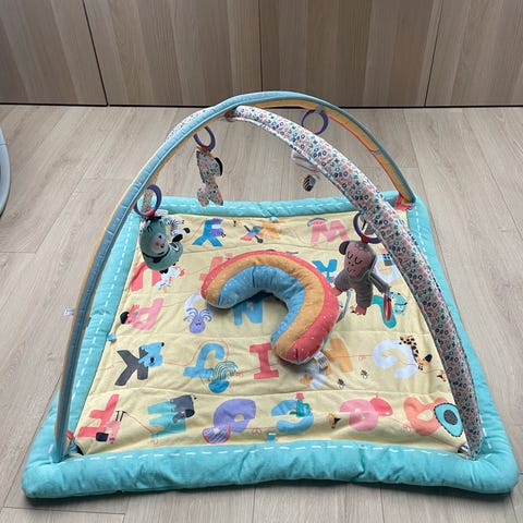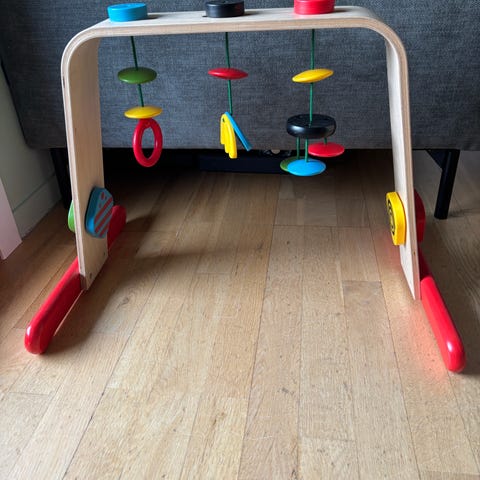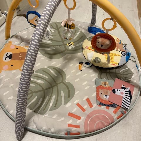 IKEA babygym aktivitetsmatte med myk, polstret matte i lyse farger med mønster og hengende leker. Passer for spedbarn for stimulering og lek.