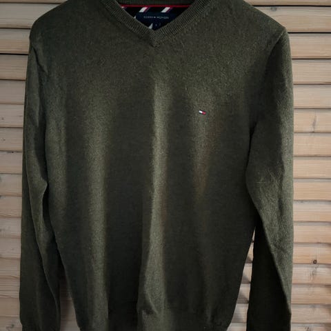 Tommy Hilfiger ullgenser i størrelse M med flerfarget mønster. Rød og svart farge som passer godt inn i juletiden. Genseren har en ribbestrikket struktur og høy hals, laget av ullmateriale som gir varme og komfort. Passer for menn. Turtleneck