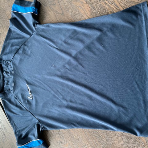 Blå treningsbukse fra Nike. Smal i bena, glidelås nederst og hvit stripe bak på leggen.