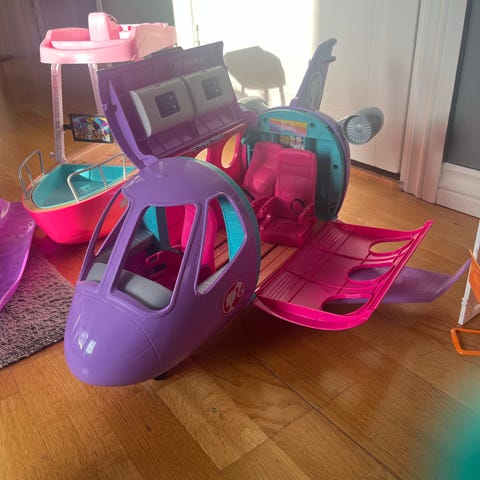 Barbie Fly leketøy i rosa med hvite vinger og detaljer. Flyet har åpne dører og plass til flere seter innvendig. Egnet som lekefly for barn.