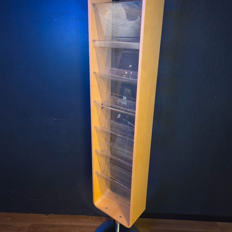 Unik hylle i tre som er beiset mørk brun selges. Brukt til dukkehus, pynte gjenstander og små bøker.