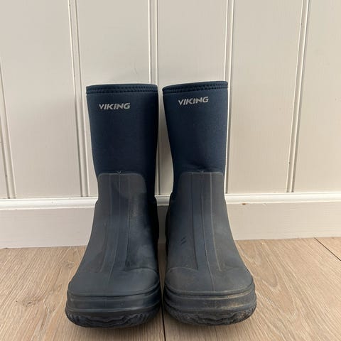 Viking Slusher barne gummistøvler i størrelse 38, unisex modell. Støvlene er laget for å være vanntette og egnet for utendørs bruk i våte forhold. De har en slitesterk gummiyttersåle og justerbar snøring øverst for bedre passform.