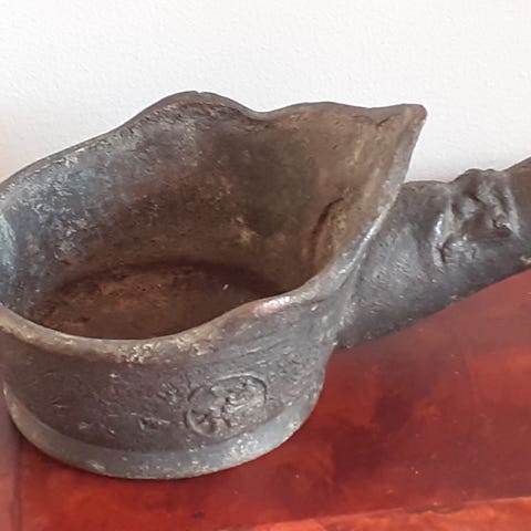 Denne har vært i mine foreldres eie i ca 40 år og kjøpt i antikvitetsbutikk. De har prøvd å finne ut hva den er brukt til, uten å gå sikkert svar. Ekspertise har antatt at det ble brukt som strykejern, ved at den var fullt med kull. De brukte den til potteskjuler. Tun og kraftig, må hentes.