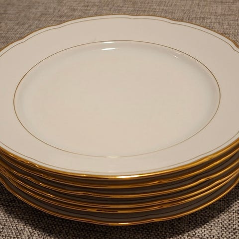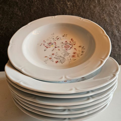 Tallerknene har delikat rose-dekor i rosa toner, bølget kant og gullkant, typisk for tidlig 1900-talls europeisk porselen. Passer perfekt til kaker, dessert, kaffebord – eller som dekor.