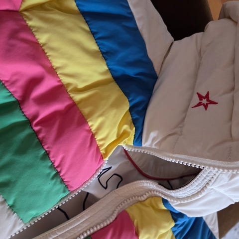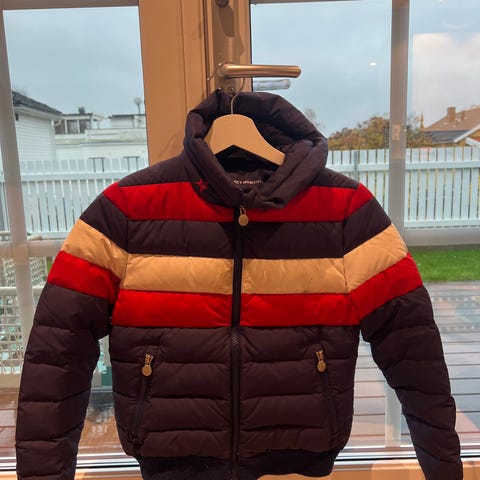 Perfect Moment Y8 barnejakke i størrelse 128, farge blå og hvit. Jakken er unisex og har en polstret design med hette. Innvendig fôr med mønster av isbjørner. Jakken har glidelåslommer og detaljer som stjerne på fronten. Jakken er nesten ikke brukt og har ingen flekker eller hull.