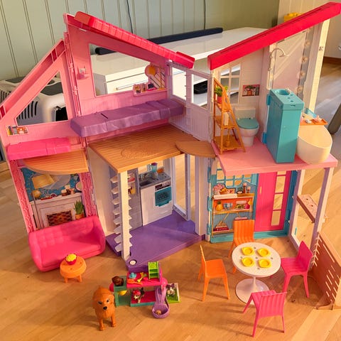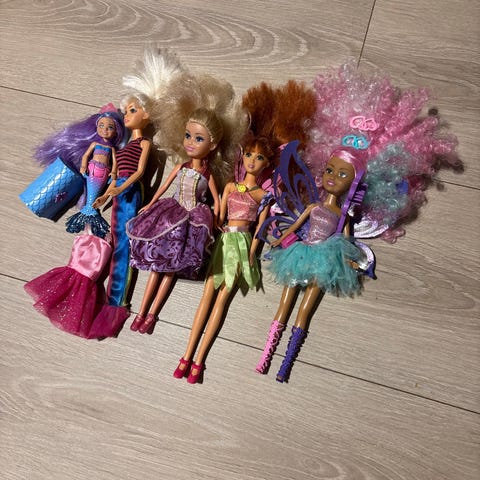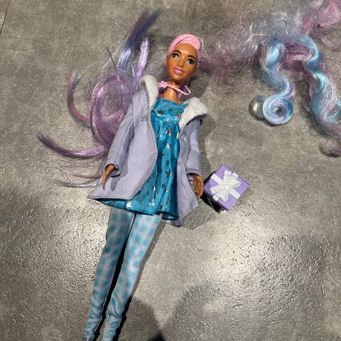 Barbie dukke med lilla scooter. Dukken er kledd i blå shorts og grå topp med rosa detaljer. Scooter har kurv bak og hjelm i matchende lilla farge.