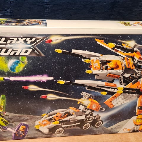 LEGO Galaxy Squad 70702 Warp Stinger fra 2013. Fine figurer. Skal være komplett, bortsett fra noen klistremerker, hvit del på kjøretøyet erstattet med sort og lilla kule erstattet med blå.
