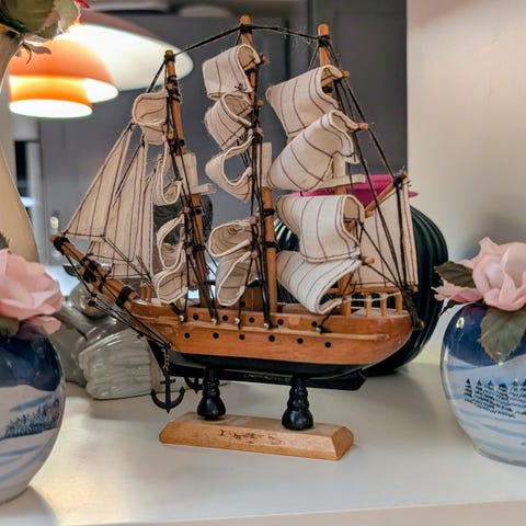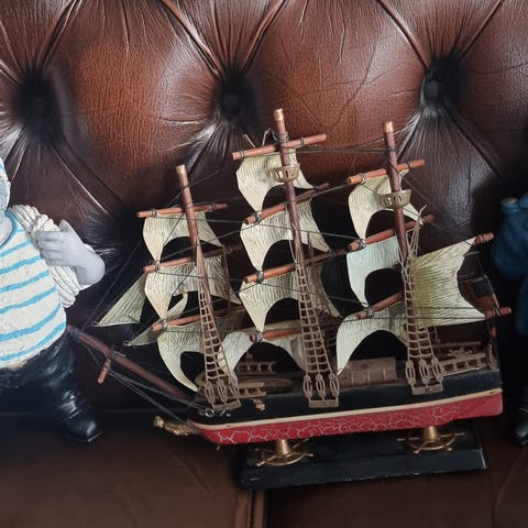 Modellskip laget i tre med detaljerte seil og rigg. Passer som dekorasjon eller samlerobjekt.