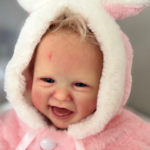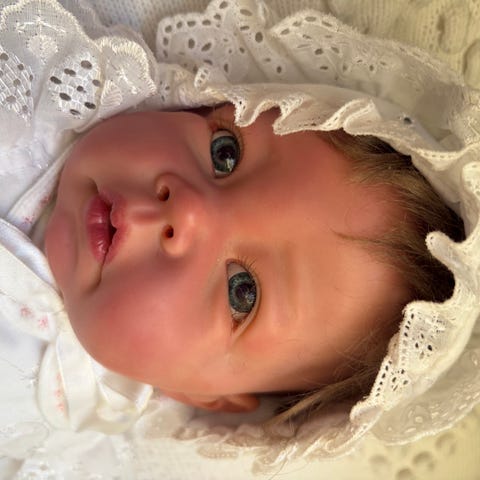 Reborn dukke selges, samlerdukke, ine of kind da ingen blir like. Denne har kun sittet på pynt I skap, veldig fine til gamle vogger og vogn, norgespakke kommer I tillegg ved sending