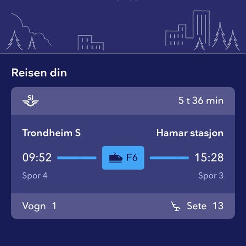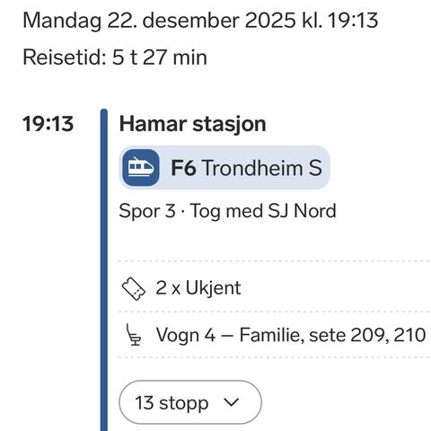 2 honnørbilletter á kr 308 selges grunnet endrede planer. Avgang Hamar 22. desember kl. 1913, ankomst Trondheim kl 00:40
