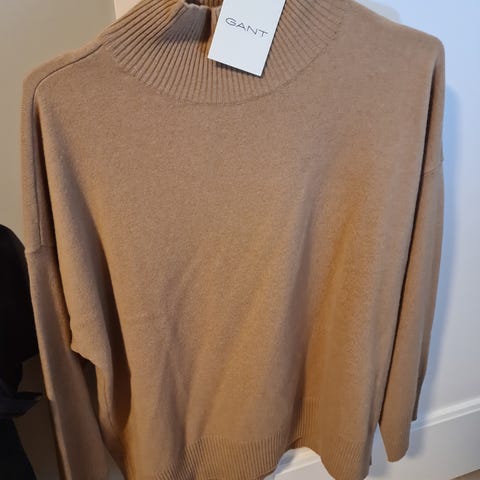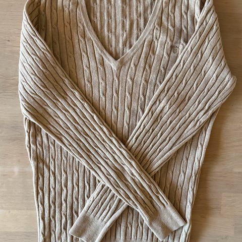 GANT Genser for kvinner i størrelse XL men passer L også,løs passform. Genseren er beige/hvit og laget av 100% ullmateriale. Den har en strukturert strikket overflate og rund hals.