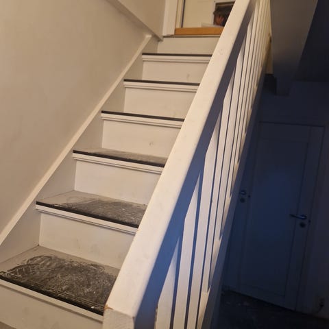 Fine trapp. Selges kun pga at etasjene skal stenges. Ca 3m i lengde, 0,95 bredde, nederst repo er 0,95 x 1,10. ca h=2,60etasjehøyde, FG Til FG