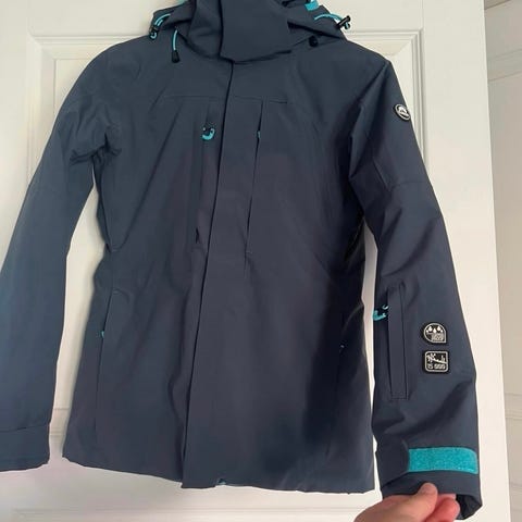 Skijakke med recco brikke og snøskjørt. Fire gode lommer, lufting foran under armene og lomme til skikort på ene armen. Noen mindre mørke flekker nede foran, se bilde.