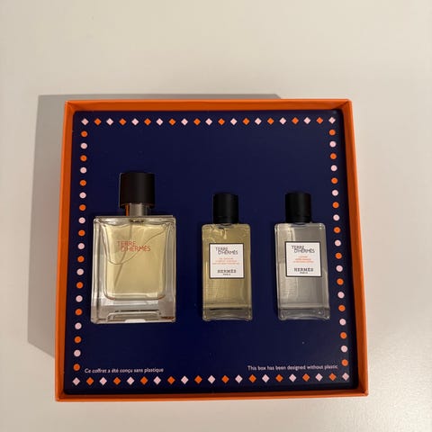 Hermès Collection Colognes parfyme sett med flere dufter i ulike farger. Inneholder eau de cologne og eau de parfum i forskjellige varianter. Emballasje i oransje med blått bånd.