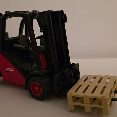 Er lekt med. Kan åpne førerhuset og reparere motor, Kan åpne luke bak for mekking. Bøyle i førerhuset kan beveges så man kan sette inn figur til å kjøre. Skuff kan løftes og tiltes. To stempler ligger løst på siden. Skulle sikkert vært festet til løftebukk, men funker helt fint å leke med. Hjulene triller godt.