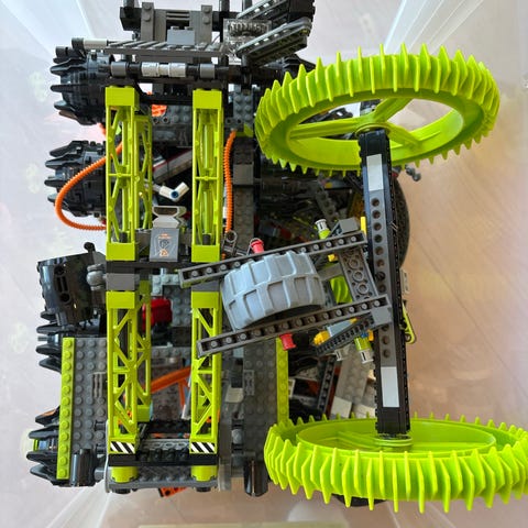 LEGO Technic byggesett som inkluderer hjul, dekk, og ulike byggeelementer i flere farger. Settet inneholder også en instruksjonsmanual for montering. Passer for konstruksjons- og teknikkentusiaster.